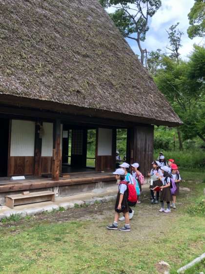 日本の昔の家を見て、子どもたちは「今の家とちがう!」と驚いていました。仲良くお弁当を食べ、少し日焼けした様子で、「ただいまー!」と元気に学校に戻ってきました。