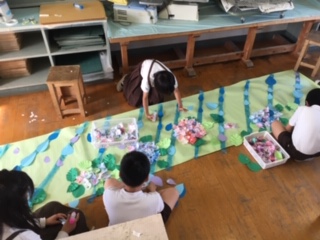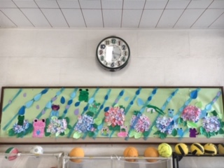 図画工作科で学習したにじみの技法を使って、あじさいの花をつくりました。かえるもたくさん描き、とてもにぎやかな玄関掲示になりました。