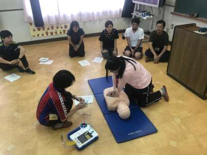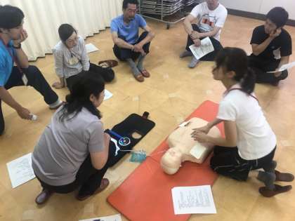 放課後に教職員みんなで、AEDの正しい使い方や心肺蘇生法、気道異物の除去などについて研修を行いました。