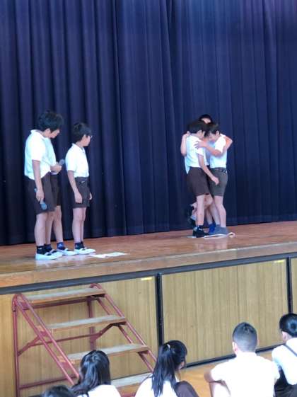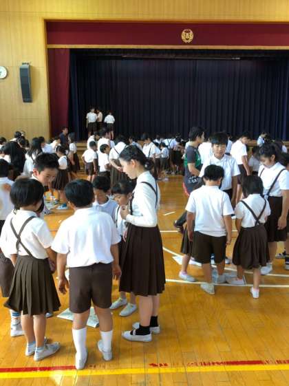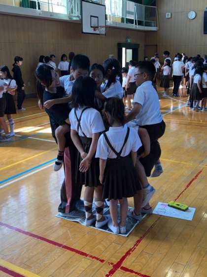 今日のハッピー集会は、「新聞紙に何人乗れるか」です。みんなが乗れるように各グループで工夫しながら、取り組んでいました。高学年が低学年を抱えたり、バランスをとりながら片足で乗ったりして協力することができました。
