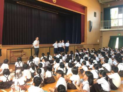 全校生の前で、4人が声を合わせて「みなさん、おはようございます!!」と言った時、聞いていた子どもたちや先生たちから大きな拍手がありました。2日間という短い期間ですが、小学校の先生という職業を楽しみながら体験してほしいと思います。