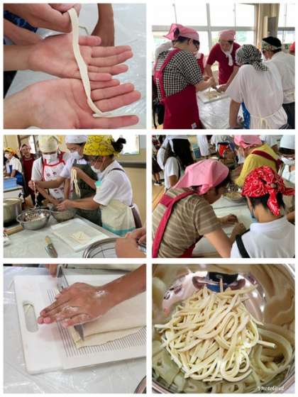 平らになったうどんだまをたたみ、細く切っていきます。均一な細さで切れるよう、地域の方々が、下敷きをご用意くださいました。