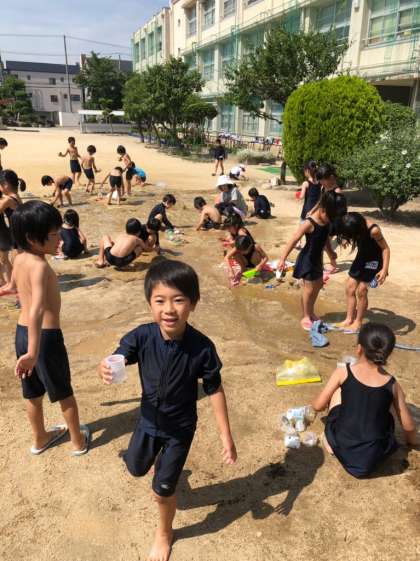 1年生はどろんこ遊びをしました。土の山に水を流して、どろどろになった土の感触を楽しんでいました。「チョコレートみたい〜!」「ぬるぬるしてる〜」と、子ども達は、楽しそうに遊んでいました。この後、シャワーを浴びて、プールに入りました。