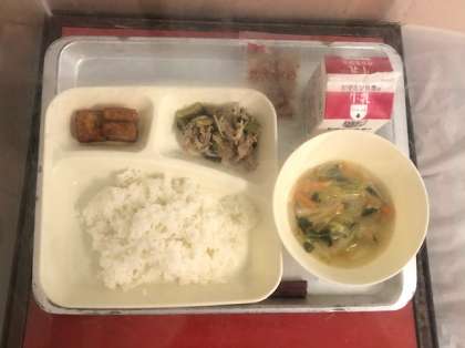 「ゴーヤチャンプルー」は、年1回だけ7月に使用できる、にがうりを使った沖縄料理です。今回も、卵は使用しません。食べる前に小袋のかつおぶしをかけることで、風味と旨みを添えています。