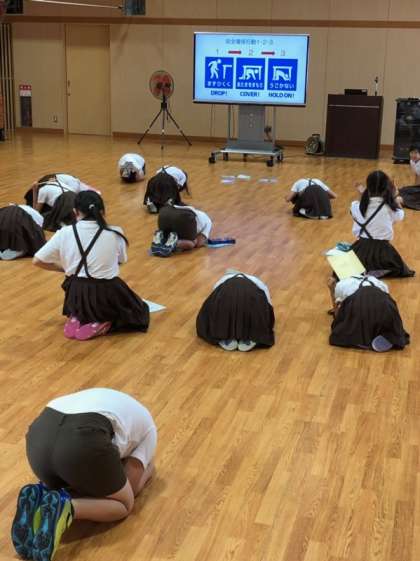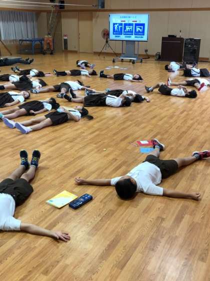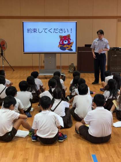 4年生の消防署見学の様子です。見学では、「地震が起こって、万が一建物が崩れ挟まった時に、どのように対処すればいいのか」や、「何が起こっても泣いてはいけない」についての具体的な対処法の説明がありました。