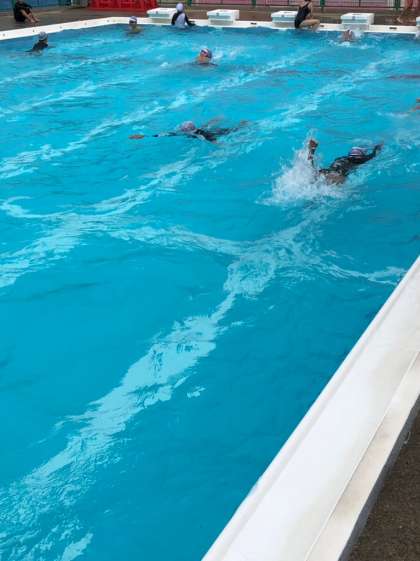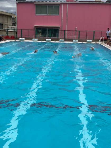6年生の水泳学習では、グループで、曲に合わせてシンクロナイズドスイミングのように、動作を考えます。どんな動作にしようかとグループで相談しながらつくりあげていく様子が素晴らしいです。