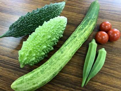 この夏、きたおかファームにはオクラ、ゴーヤ、トマト、きゅうりなどたくさんの夏野菜が立派に実っています。
