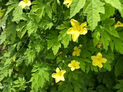 2枚目の写真はゴーヤの花です。きれいな黄色い花が咲いています。