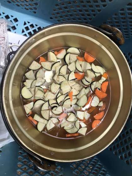 野菜を切る、むくなど班で協力して作っています。