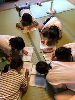 夕食までの時間をそれぞれ過ごしています。くつろいでいる子もあれば、しおりを書いている子もいます。