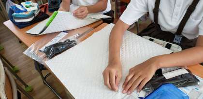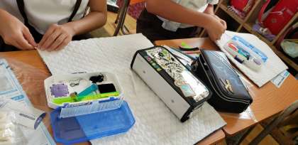 家庭科の学習でナップサック作りが始まりました。世界で一つだけの手作りナップサックを背負って修学旅行に行きます。