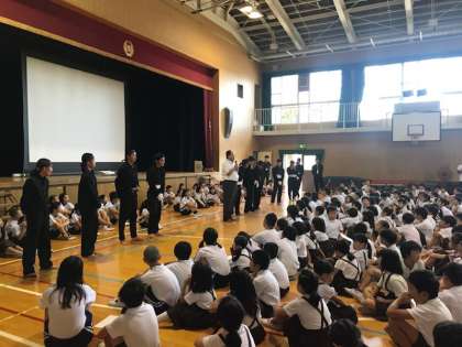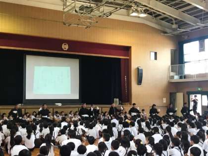 これは、毎年行われているもので、泉尾工業高校の応援団のみなさんが本校の応援団にエール交換を教えてくれて、全校生でやってみようという取り組みです。特徴あるしぐさを休み時間にまねしている児童がいて、運動会にむけてさらに活気が出てきました。