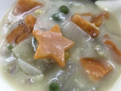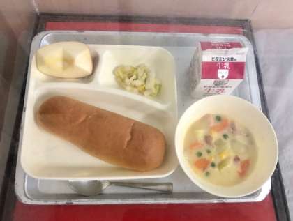 「コーンクリームシチュー〔米粉〕」は、小麦アレルギーのある児童も食べられるように、上新粉を使ってとろみをつけています。スイートコーン、コーンの他に、鶏肉、ベーコン、じゃがいも、たまねぎ、にんじん、グリンピースを使っています。今日は、ラッキーにんじんが入っている日でした。見つけた児童は、とても喜んでいました!