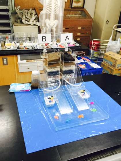 AとBの地層ではどちらが水をきれいにすることができるのかを、本格的な装置を使って調べました。