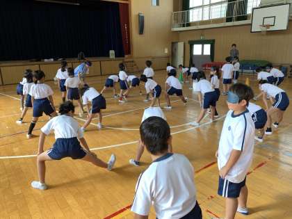 準備体操は子どもたちでペアになって、一人がアイマスクをつけて、もう一人がサポートをする人になって、サポートの難しさを感じることができました。