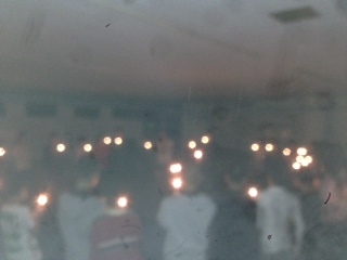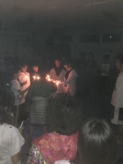 強風のため、屋外でのキャンプファイヤーをやめ、屋内でのキャンドルファイヤーを実施することにしました。キャンプファイヤーとはまた一味ちがった、幻想的な雰囲気が作り出されています。