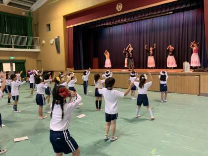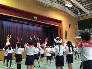 今日は、生涯学習のフラダンスのみなさんにフラダンスを教えてもらいました。ハワイの花の首飾り「レイ」や髪飾り、腕輪をして、楽しみながら伝統のダンスを踊りました。