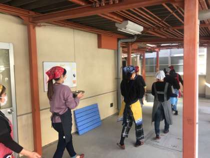 そのあと、実際に子どもたちが食べている給食を食べていただきました。子どもたちが準備するのと同じように児童だまりに行き、配膳をし、みんなで元気よく「いただきます!」をしました。