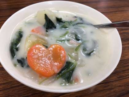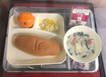 ほたて貝のクリームシチューには、ハート形のラッキーにんじんが入っていました。見つけた児童は、「入ってたよー!」「私、いつも当たるねん♪」などとみんな報告してくれました。