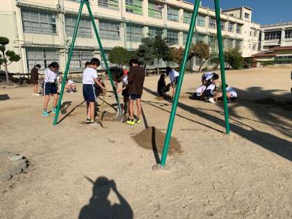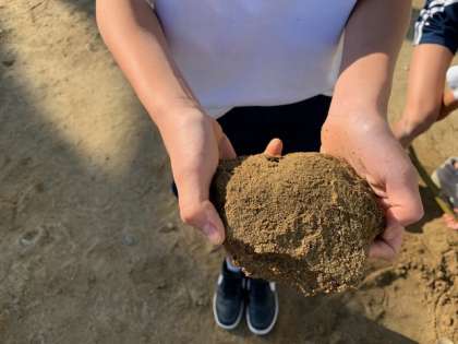 理科の学習です。大地のしくみを実際に見てみるために、運動場を掘ってみました。しばらく掘り進めると、粘土層にたどり着きました!