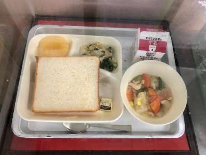「スープ煮」は、鶏肉を主材に、だいこん、キャベツ、にんじん、コーンを煮、塩、こしょう、うすくちしょう、チキンブイヨンで味付けし、青みにさんどまめを加えて、彩りよく仕上げています。