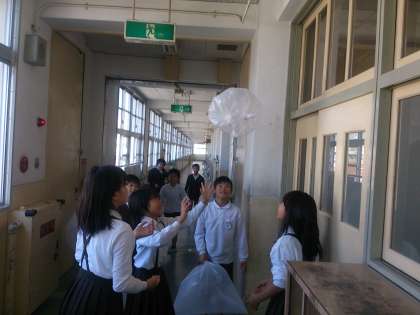 4年生の理科の学習です。空気をビニール袋にとじこめて、押したり、とばしたり、はじいたりして、空気を感じる実験をしました。身近にある空気は何もしなければ、なかなか感じることはできませんが、今回は袋にとじこめることで、「ぼわっとした!」「おしかえした!」「かるい!」などなど、色々実感することができました。みんな楽しい実験に大はしゃぎしていました。