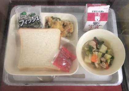 「鶏肉とじゃがいものスープ煮」は、鶏肉を主材にじゃがいも、キャベツ、だいこん、にんじん、さんどまめを使用した洋風の煮ものです。