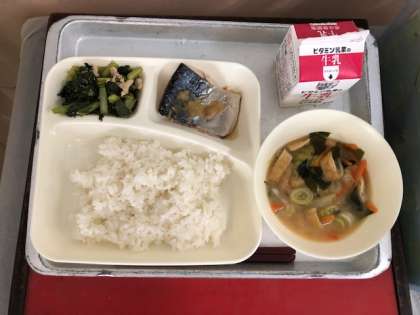 「みそ汁」は、じゃがいも、うすあげ、はくさい、にんじん、白ねぎ、わかめが入ったみそ汁です。