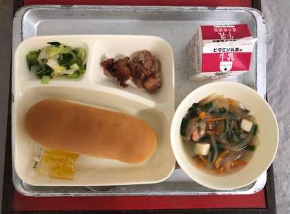 「えびととうふのスープ」は、えび、とうふ、たまねぎ、にんじんを使用し、青みににらを加えています。この献立は、【えび】の個別対応献立です。