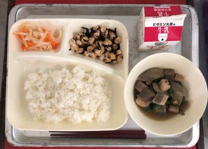 「ひじき豆」は、でん粉をまぶし、油であげた大豆に、ひじきが入ったタレをからませます。鉄や食物繊維を多く含む献立です。