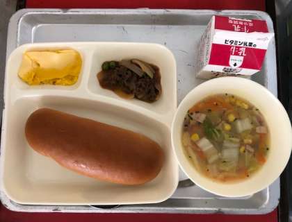 「コーンスープ」は、ベーコンの旨みとコーン、スイートコーンの甘みが調和した、児童生徒に人気のあるスープです。彩りにパセリを使用しています。