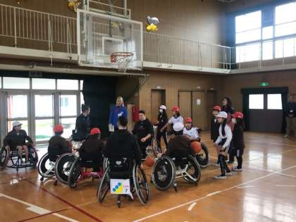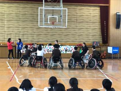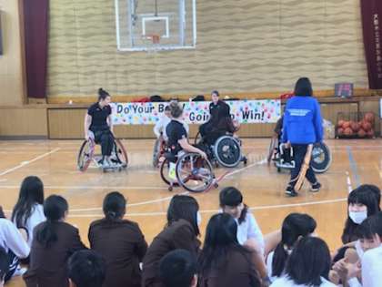 2020国際親善女子車いすバスケットボール大阪大会地域親善交流会を本校で行いました。カナダ選手のみなさんによるデモンストレーションは、迫力たっぷりでとても素晴らしかったです。子どもたちからは自然と歓声があがりました。