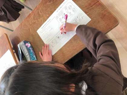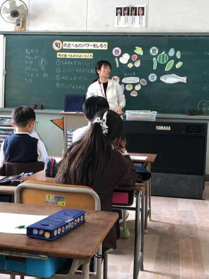 今日、山本先生と栄養の学習をしました。自分たちが育ててきた様々な野菜と関連付けて、作物の「旬」について学びました。給食で出てくる食材には「旬」のものが多いことに驚いていました。