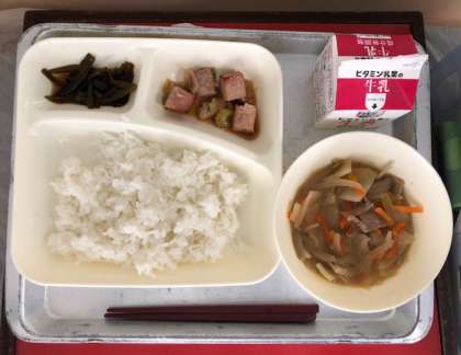 「豚汁」は、豚肉を主材に、じゃがいも、たまねぎ、だいこん、ごぼう、にんじんを使っています。
