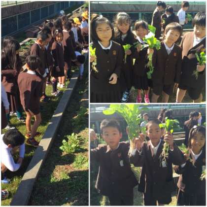 今日は2学期に種まきをした「天王寺蕪」を収穫しました。