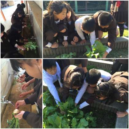 今回収穫した蕪は11月16日にある「3校合同PTAイベント」での1つのブースで使います。その準備のために、一生懸命冷たい水で蕪を洗っていました。