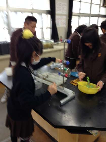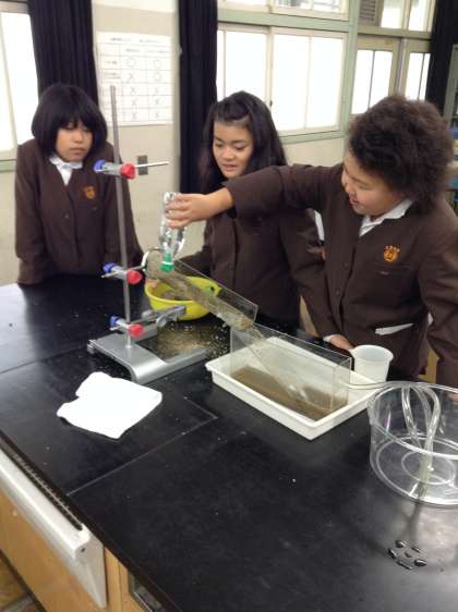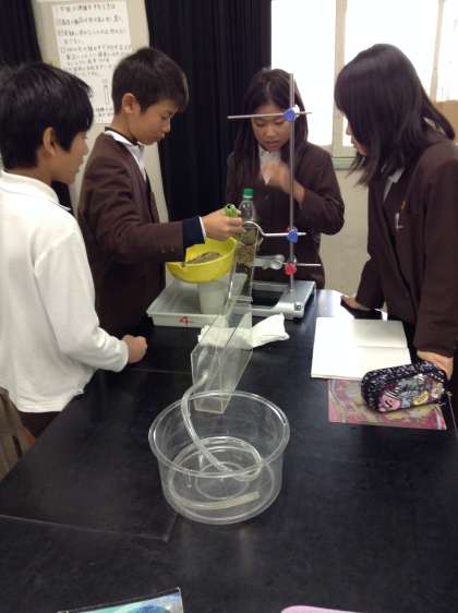 少しずつ水を流して、濁りがなくなったらまた水を流して。地層ができていきます。