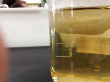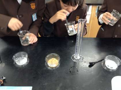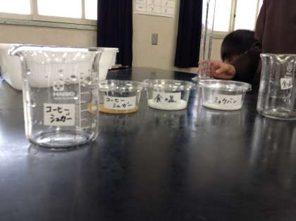 理科室では、5年生が水溶液の実験・観察をおこなっていました。コーヒーシュガーを水に入れると、もやもやしたものが出てくる(シュリーレン現象)。や砂糖、塩、ミョウバンが何杯溶けるのか。といったものでした。
