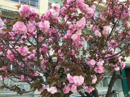 校庭には春の生命が次々と。樹々には美しい花が咲き、蝶々の姿も見られます。
