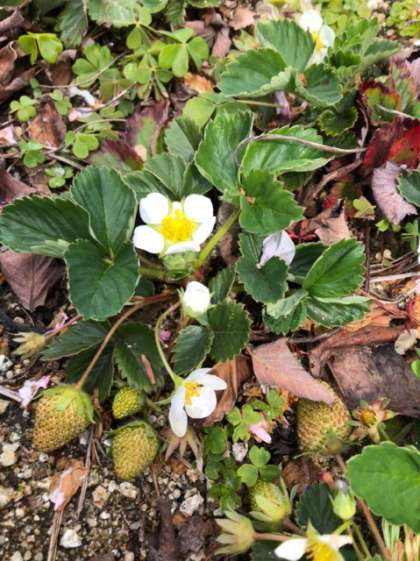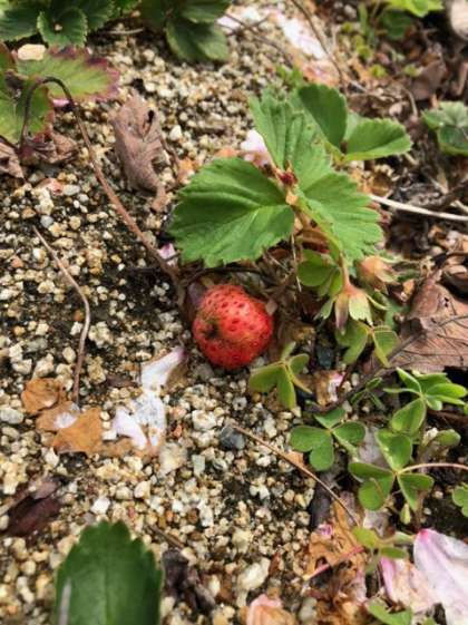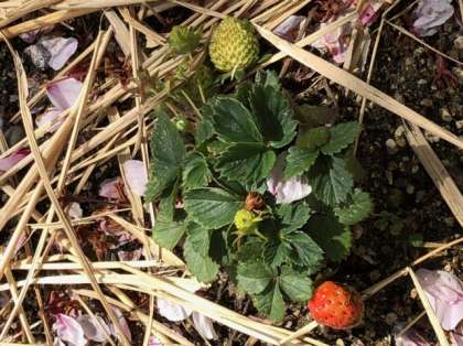 なかよし学級の学習園では、いちごの実ができてきました。そろそろ赤くなってきそうですよ。