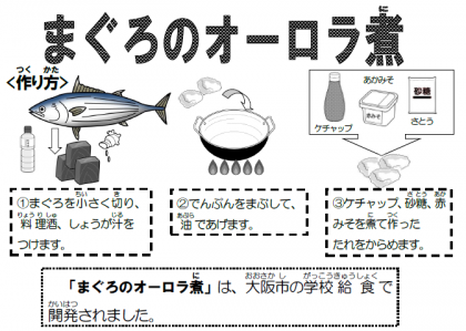 今回は、4月の給食で登場する予定であった『まぐろのオーロラ煮』のレシピを紹介します♪こちらも児童にとても人気のある献立です!
