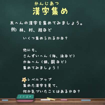 ことばあつめや漢字集めは、知っている言葉や単語を増やし、使う機会を与えることで、語彙力を高める遊びになります。
