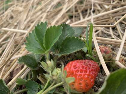 なかよし学級の学習園ではたくさんのいちごが実をつけています。はじめは雑草に埋もれ1株だけだったいちごが、丁寧にお世話をすることで、花壇半分もの面積を占めるほどに増えました。