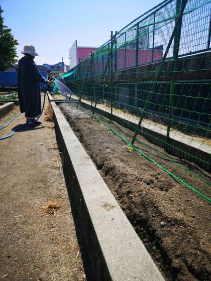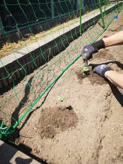 学習園では、それぞれ新しい作物を植えています。ゴーヤとキュウリとサツマイモの苗を植えました。