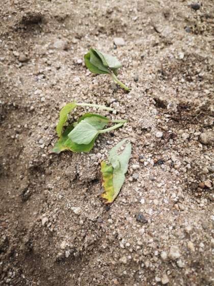 サツマイモは、しおれているように見えますが、大丈夫です。植え付け時は、根がないので、このような状態になります。根が張れば、元気に吸水して自立します。