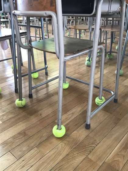 立ったり座ったりするときにいすを動かすと、大きな音がしますね。テニスボールをつけることで、その音がほとんどしなくなります。静かな中で学習するための工夫です。