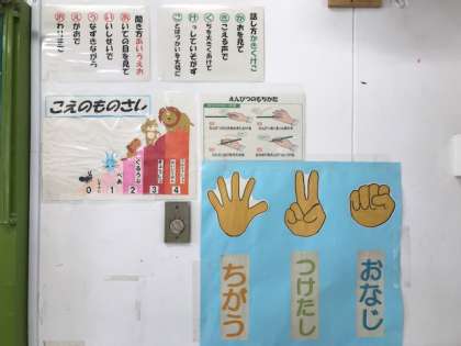 他にも教室の中には、「聞き方・話し方のルール」「声の大きさのものさし」「鉛筆の持ち方」「ハンドサインの方法」などの掲示物があります。