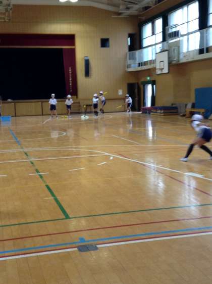 講堂では、4年2組がティーバッティングを行っていました。みんな芯でとらえ、するどい打球を飛ばしていました。そして守備も上手でした。