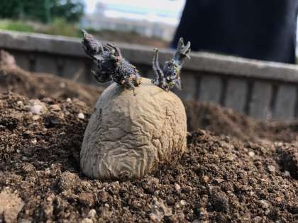 4月の終わりごろに植えました。その時のじゃがいもは、「これが食べられるじゃがいもになるのかな」と思うような形をしていました。(写真1)