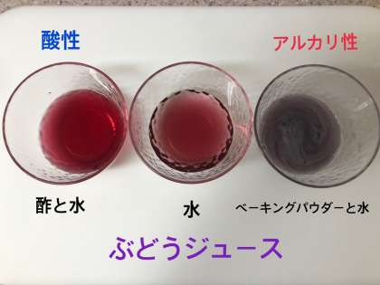 ぶどうジュースに、酢(酸性)や、ベーキングパウダー(アルカリ性)を入れてみるとどうなるでしょう。